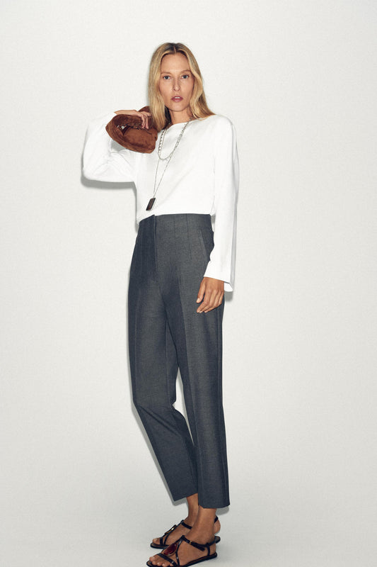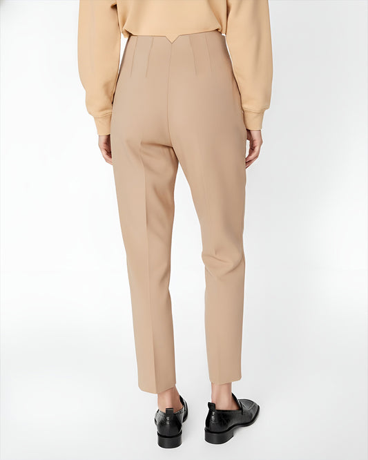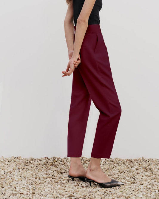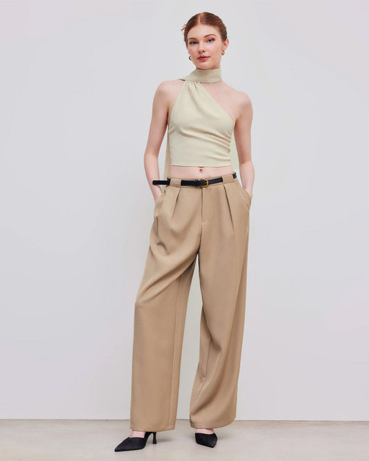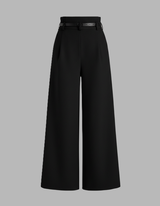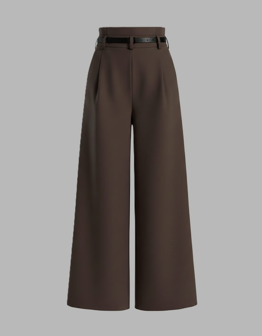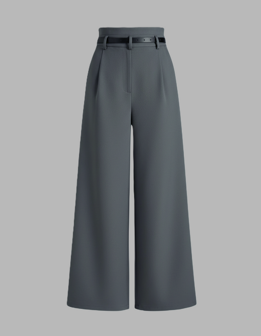 Details: Stretchable pants with a wide belt and a rectangular buckle complement the clean, minimalist style of the pants.