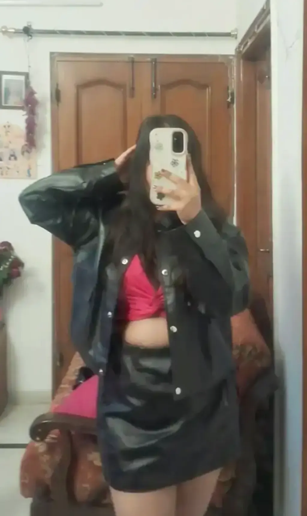 [Set of 2] Black Leather Jacket & Ruched Skirt Set