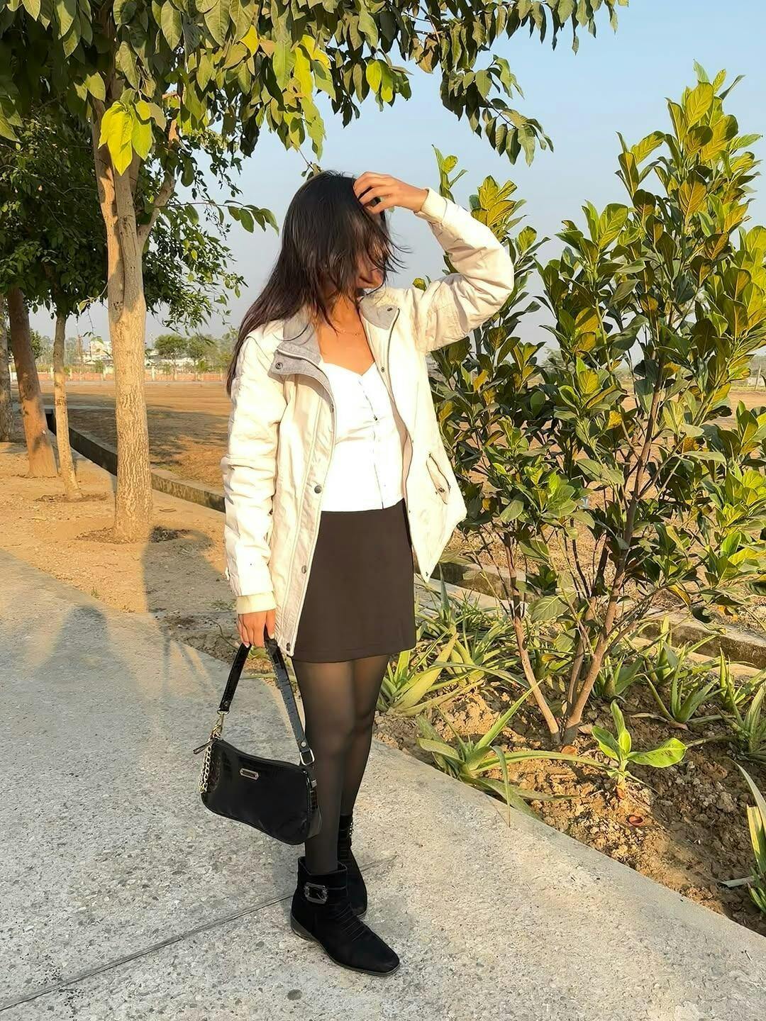 Style this white fitted top with high-waisted jeans and sneakers for a casual chic look, or layer it with a blazer and ankle boots for a more polished outfit. Pair it with a midi skirt and strappy sandals for a feminine touch, or opt for wide-leg trousers and chunky sneakers for a bold, street-style vibe. Minimal jewelry, such as gold hoops or dainty necklaces, will elevate the look.
