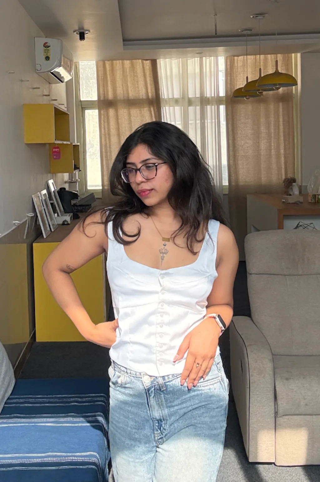 Style this white fitted top with high-waisted jeans and sneakers for a casual chic look, or layer it with a blazer and ankle boots for a more polished outfit. Pair it with a midi skirt and strappy sandals for a feminine touch, or opt for wide-leg trousers and chunky sneakers for a bold, street-style vibe. Minimal jewelry, such as gold hoops or dainty necklaces, will elevate the look.