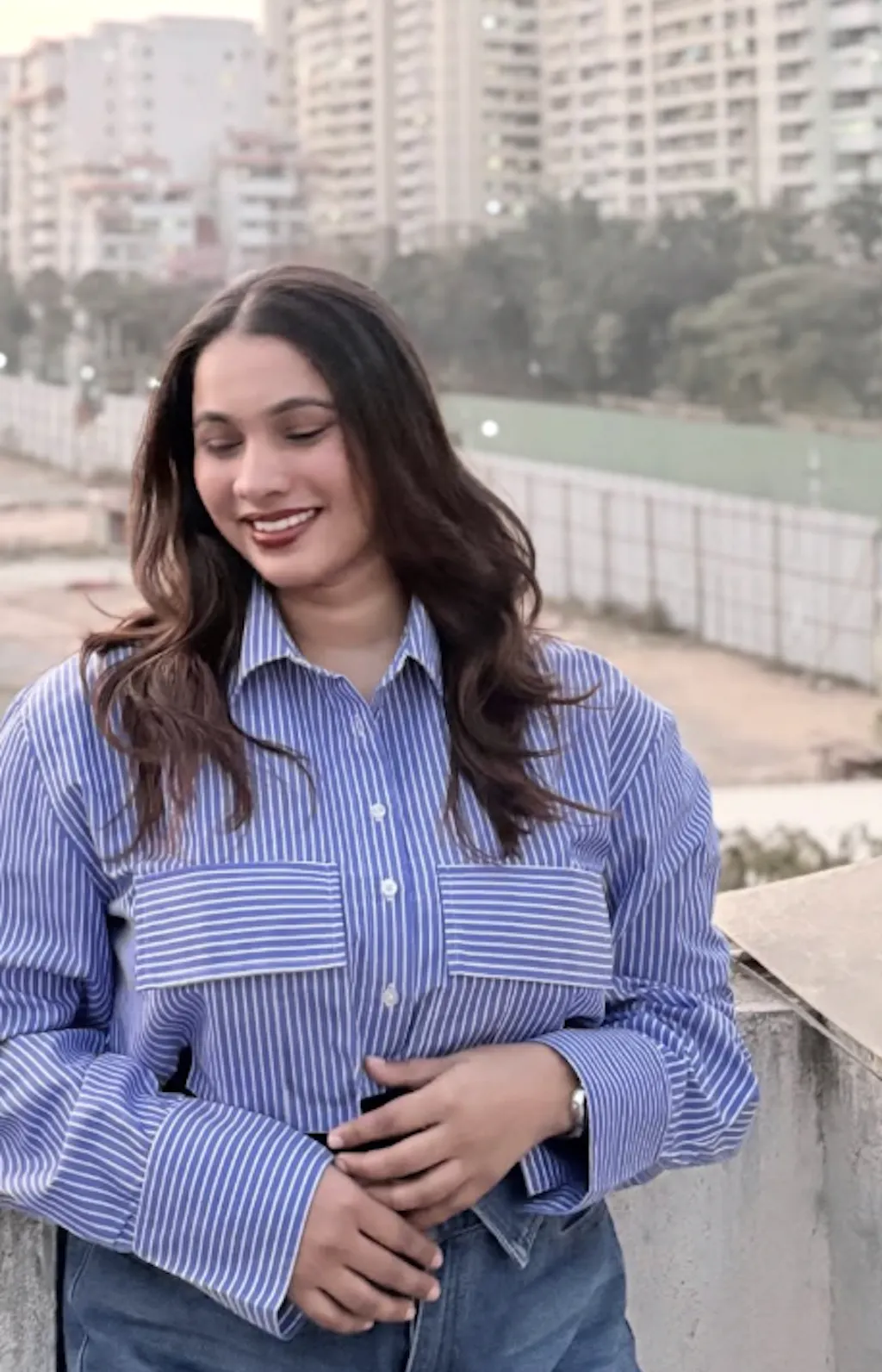 Blue always stays in fashion. This semi-formal crop shirt gives 'classic' with its old money pinstripes. Add it for a low-key formal look that is big on style when paired with straight fit - high waist trousers.