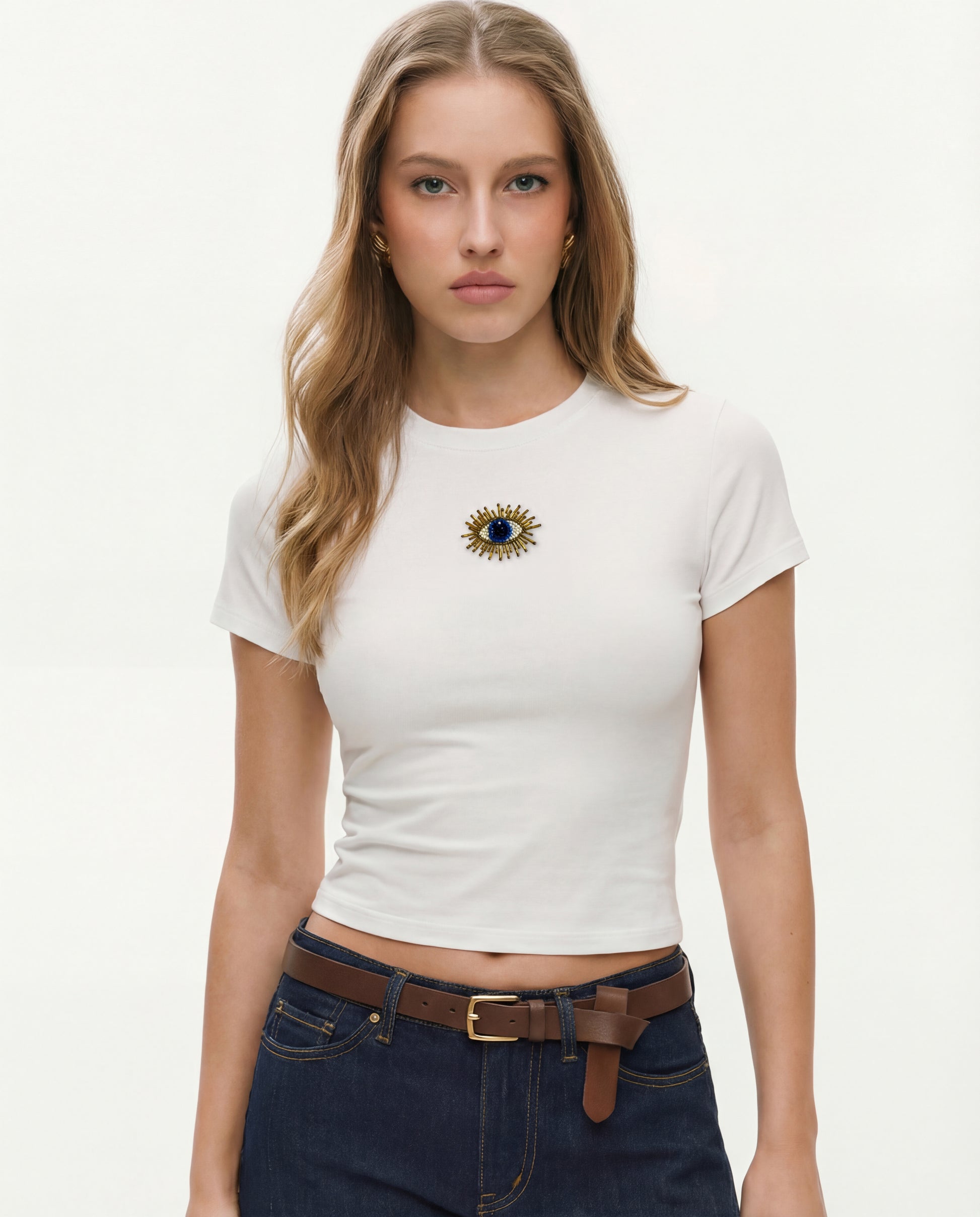 Details: Minimal yet striking, this white baby tee showcases a beaded evil eye motif for a symbolic statement. Made in soft cotton-spandex jersey, it features a cropped slim fit with a classic round neckline and short sleeves. The detailed embellishment adds subtle dimension. Style it with high-rise jeans or tailored trousers for a balanced, chic look.
