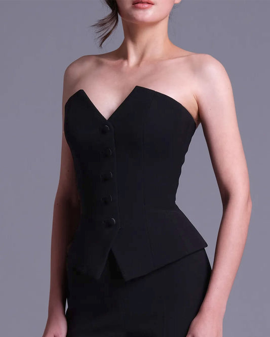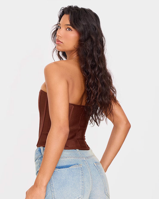 Detail: This structured corset is crafted from brocade fabric. It has boning in the front, with tie-up straps and a back zipper. It does not have pads. The model is wearing size small with chest size of 34-35 inches.
