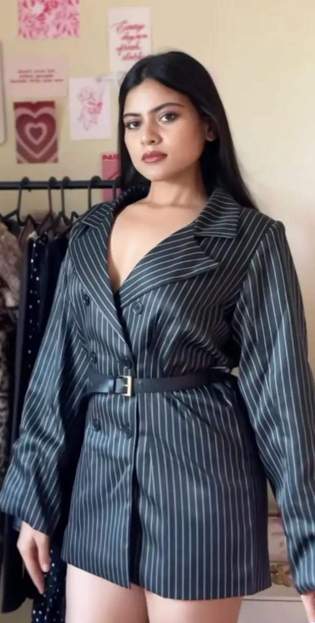 Detail: Elevate your look with a double-breasted pinstripe blazer cinched at the waist with a bold gold buckle belt. The belt adds structure and a luxe edge, transforming classic tailoring into a modern power statement. Pair it with a mini panel skirt for a sharp yet feminine silhouette.