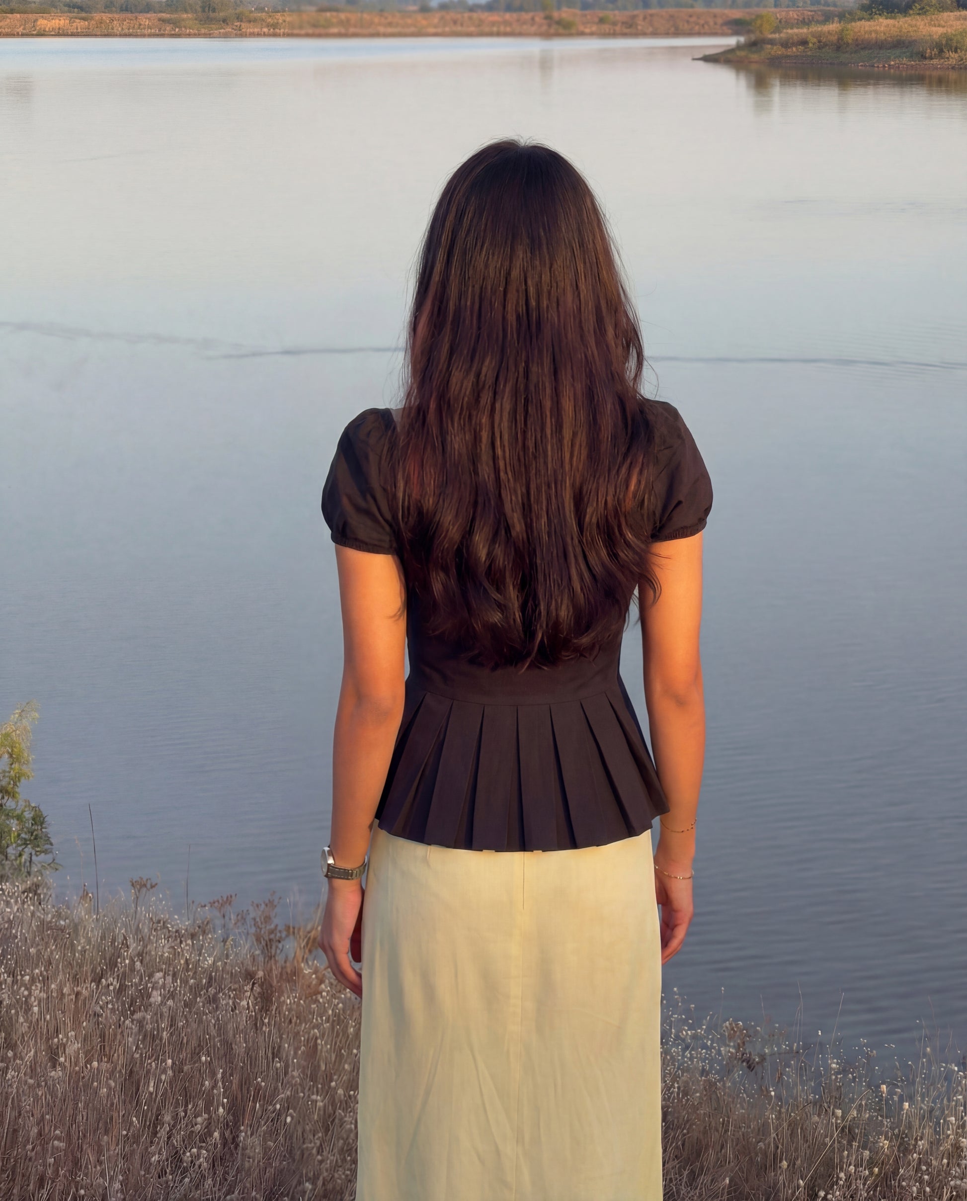 Detail: The bodice has a fitted, panelled design with subtle vertical stitching for a structured look. The hem is slightly flared with soft pleats, adding a touch of femininity.