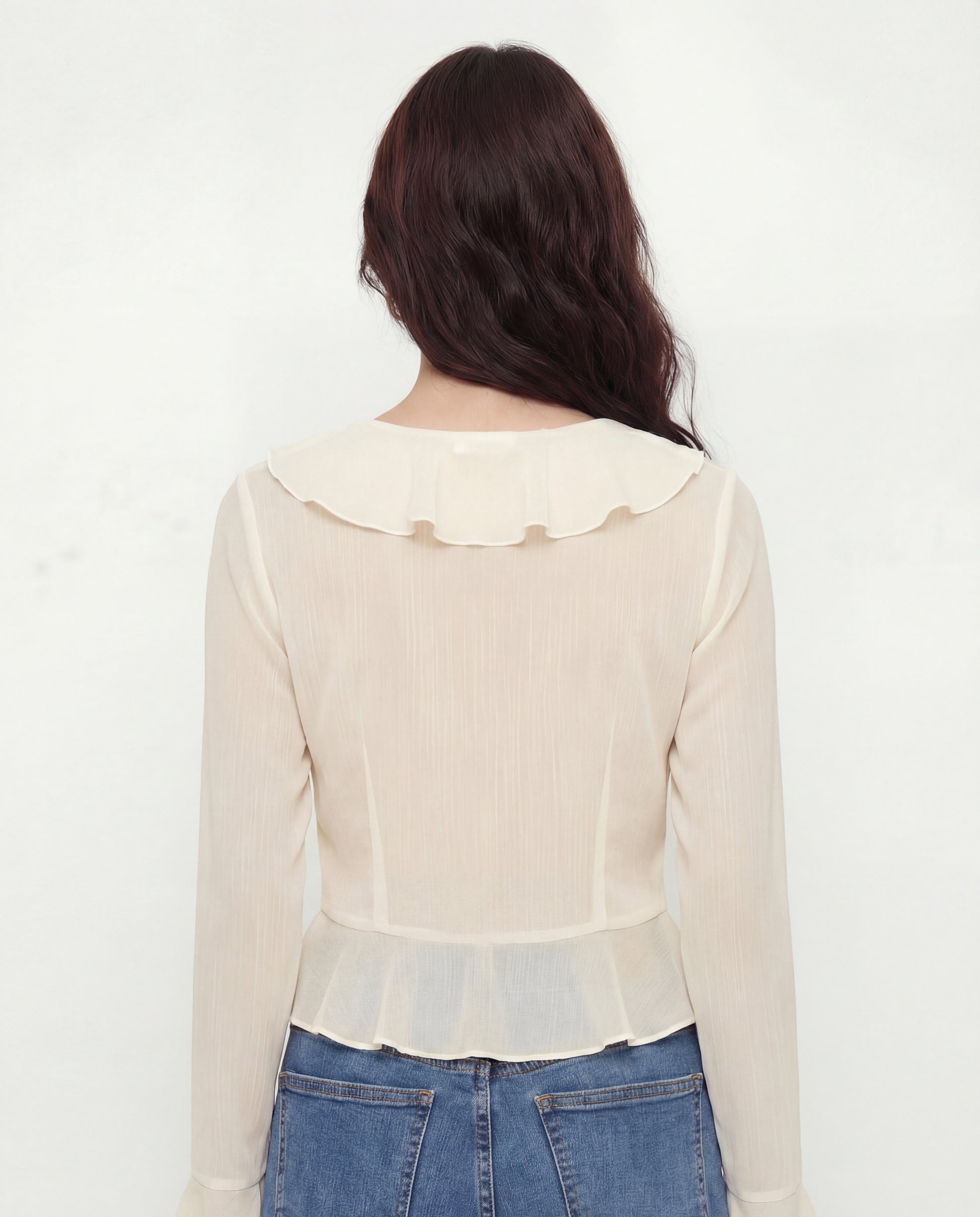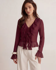 Ruffled Tie Front Flared Sleeve Top - Ivory