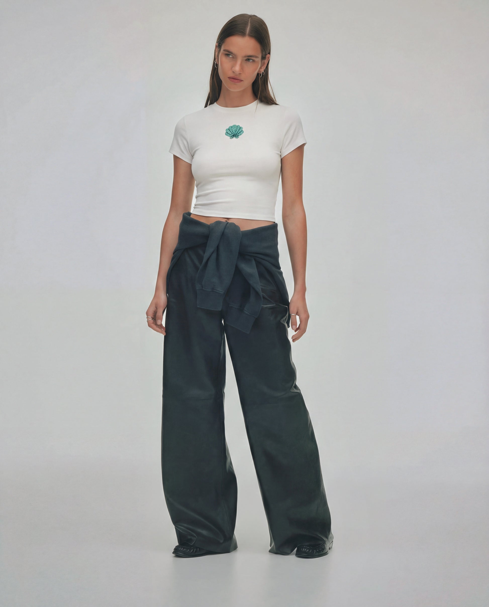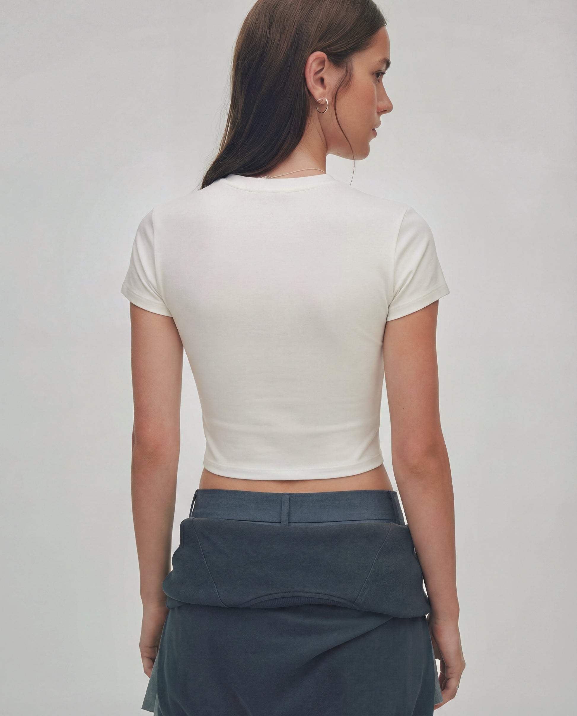 Details: Bring coastal charm to your wardrobe with this white baby tee featuring a delicate beaded seashell detail. Crafted in stretch jersey fabric, it offers a cropped, body-hugging fit with a timeless round neckline. The subtle embellishment adds texture without overpowering the look. Pair it with linen pants or denim shorts for effortless summer styling.