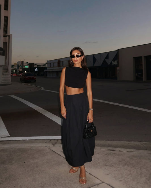 Pair this black slit dress with statement earrings and metallic strappy heels for a touch of glam. Add a sleek blazer or leather jacket for layering, and finish with a bold red lip and soft waves or a sleek bun. A small clutch or mini bag completes the chic, elegant look.
