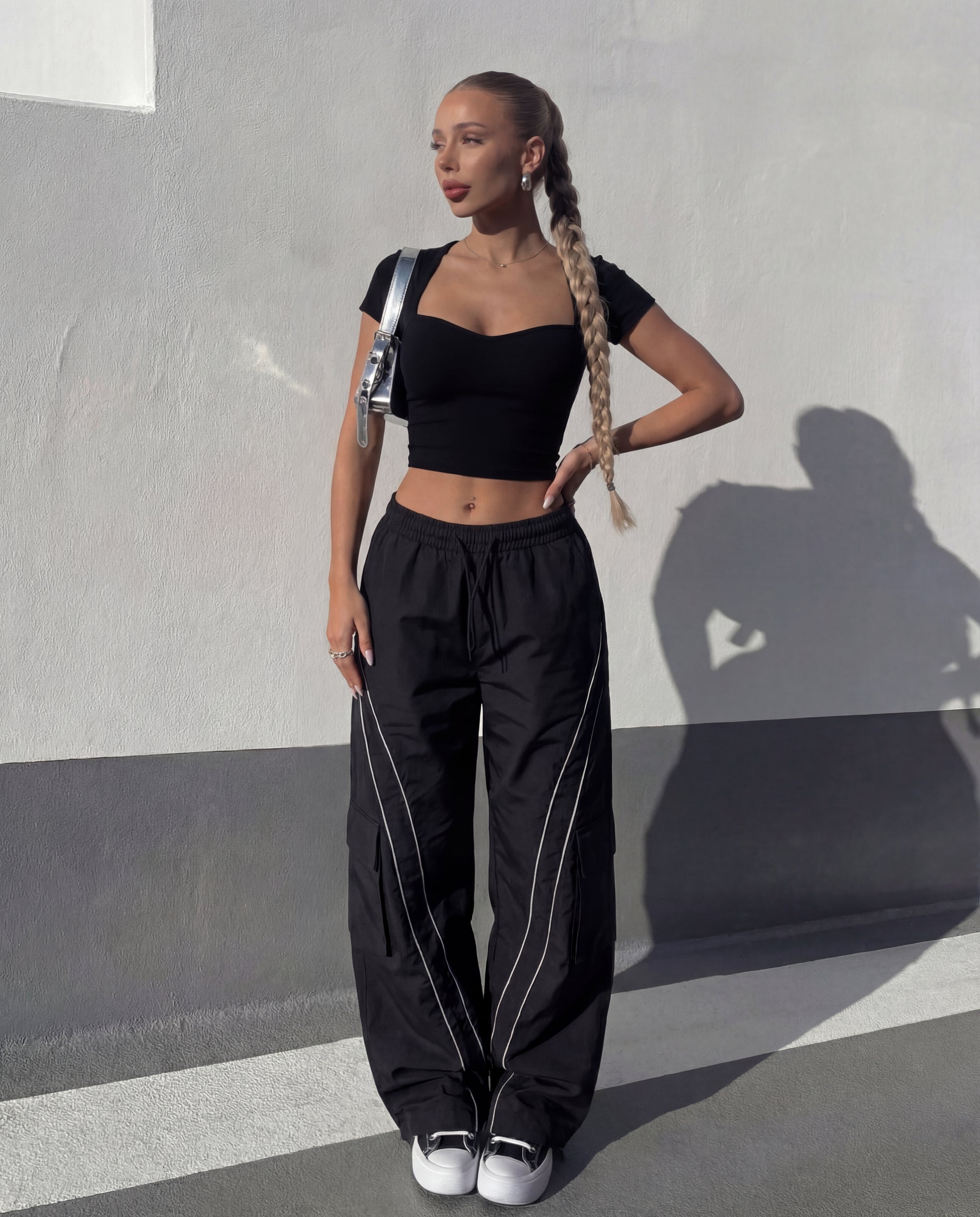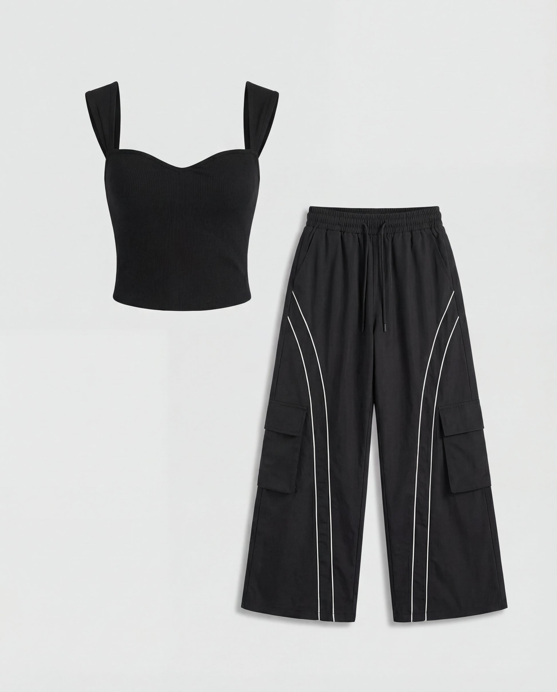 Sweet Heart Neckline Ribbed Top With Stripped Baggy Korean Pants