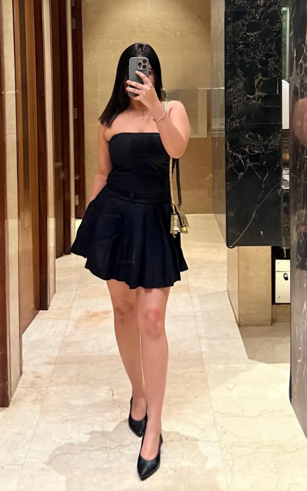 Black off-shoulder mini dress - This is an outfit for your first date when you are in the text-talking era and not trying too hard. Get some translucent black tights to look modest, or go bare-legged because it's raining!