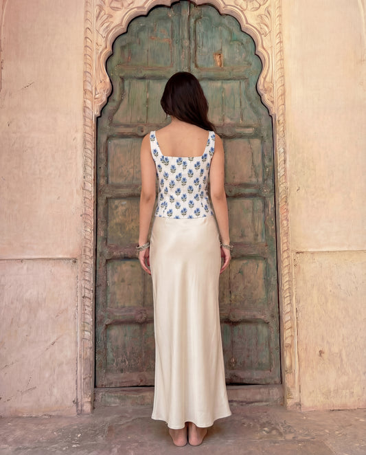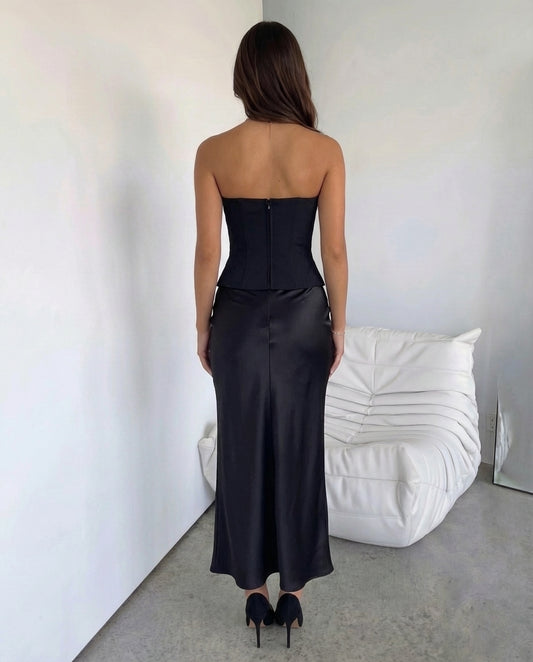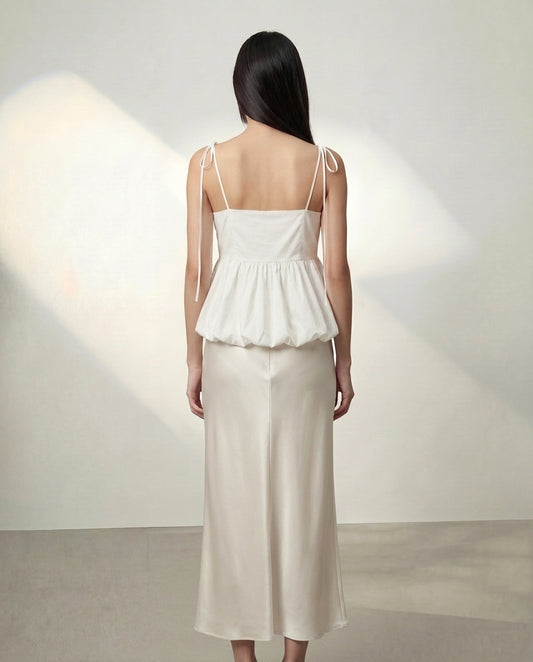 White Slit Top And Skirt Set With A Waist Tie