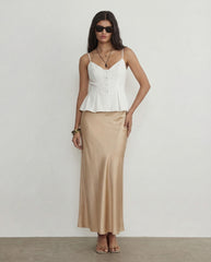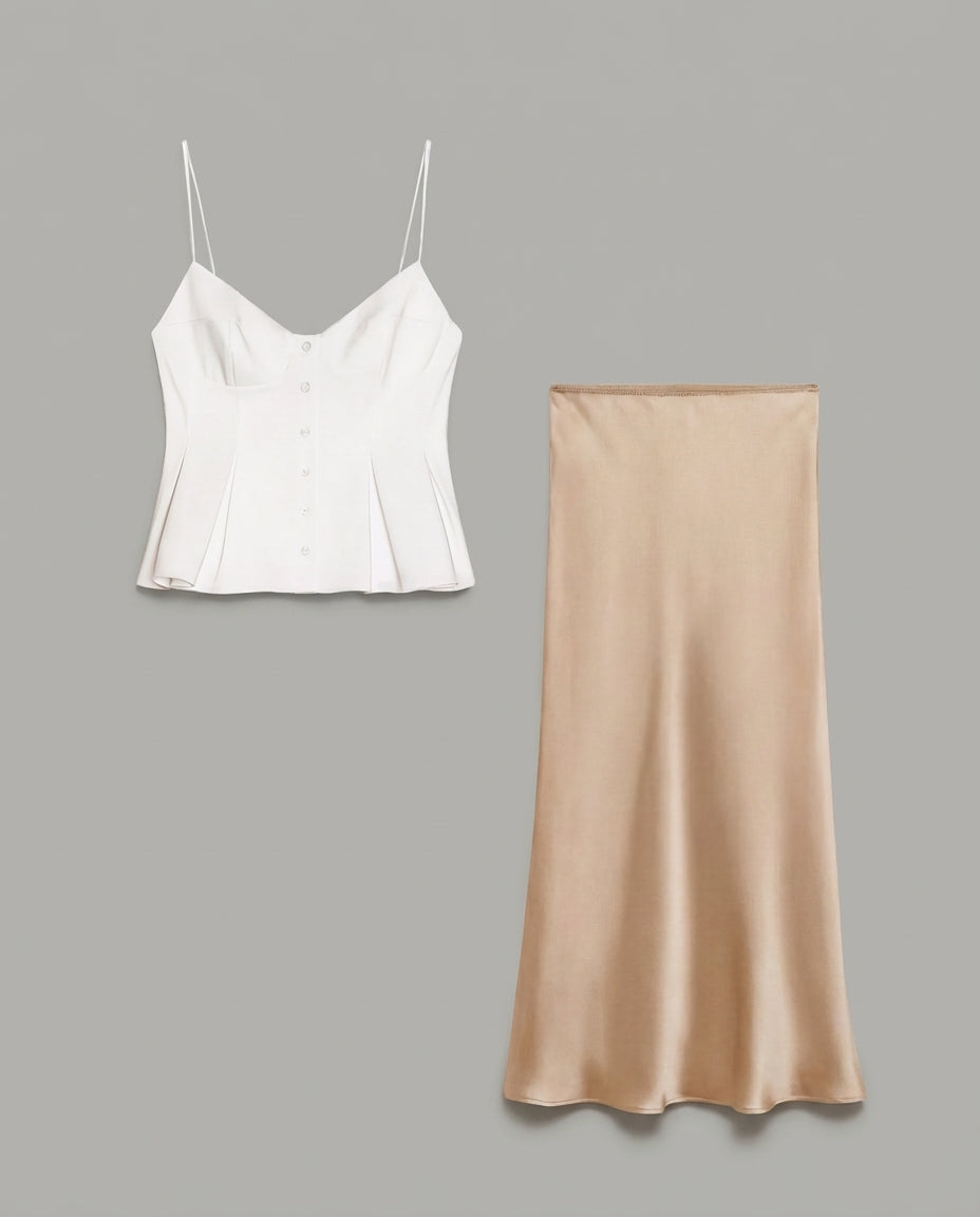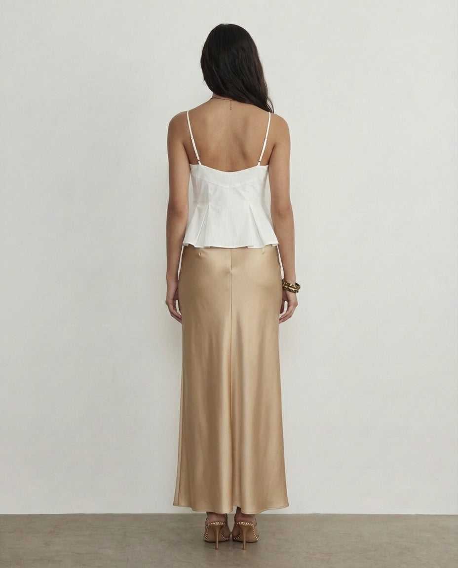 White Spaghetti Strap Peplum Top With Champagne Satin Skirt